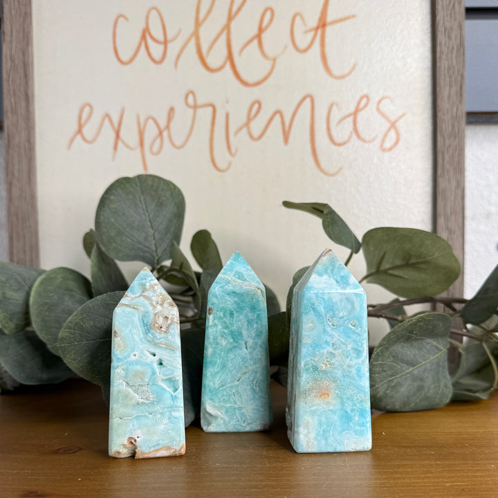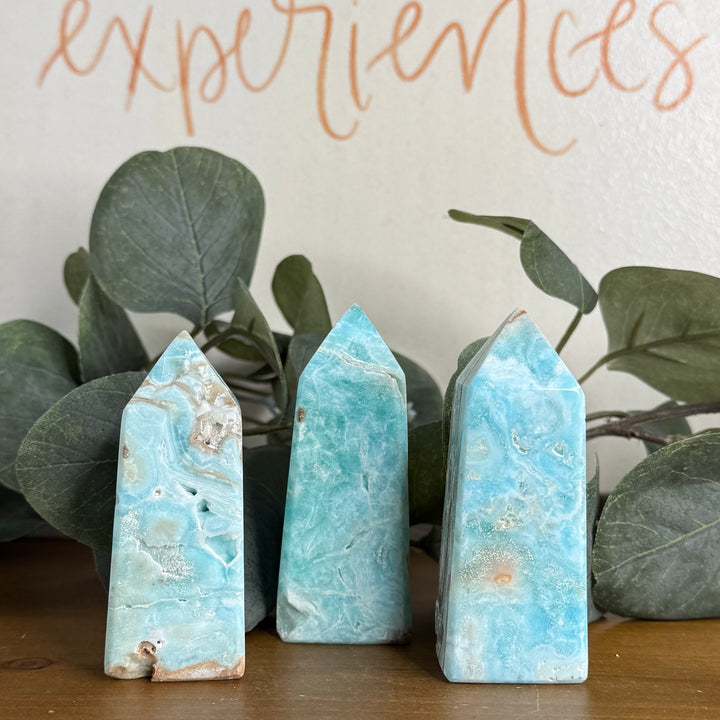 Each tower displays delicate waves of aqua and sky-blue hues, reminiscent of tranquil waters. Blue Aragonite is known for easing emotional tension, supporting empathy, and guiding gentle self-expression. It helps release old emotional patterns, replacing them with clarity and kindness.