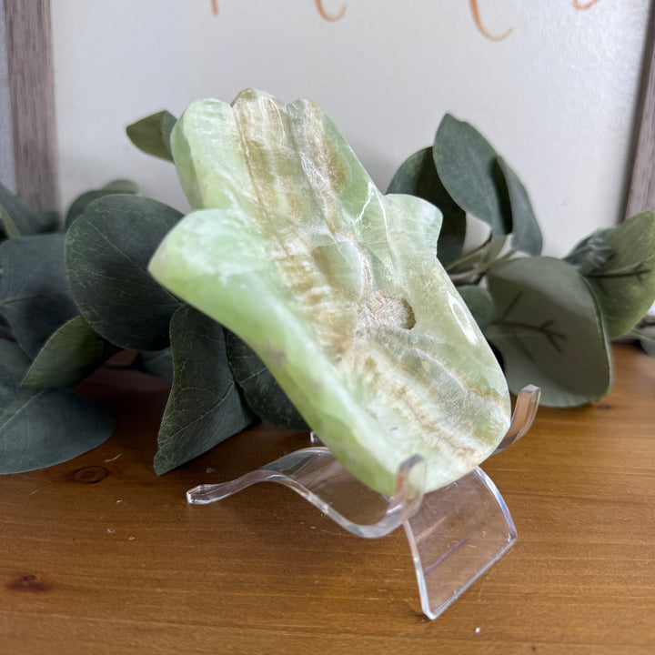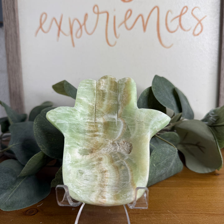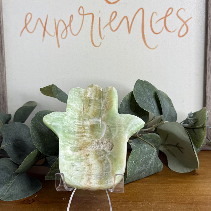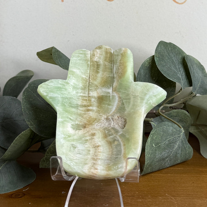 🌿 Pistachio Calcite Hamsa (Mint-Green) — Heart Healing & Renewal