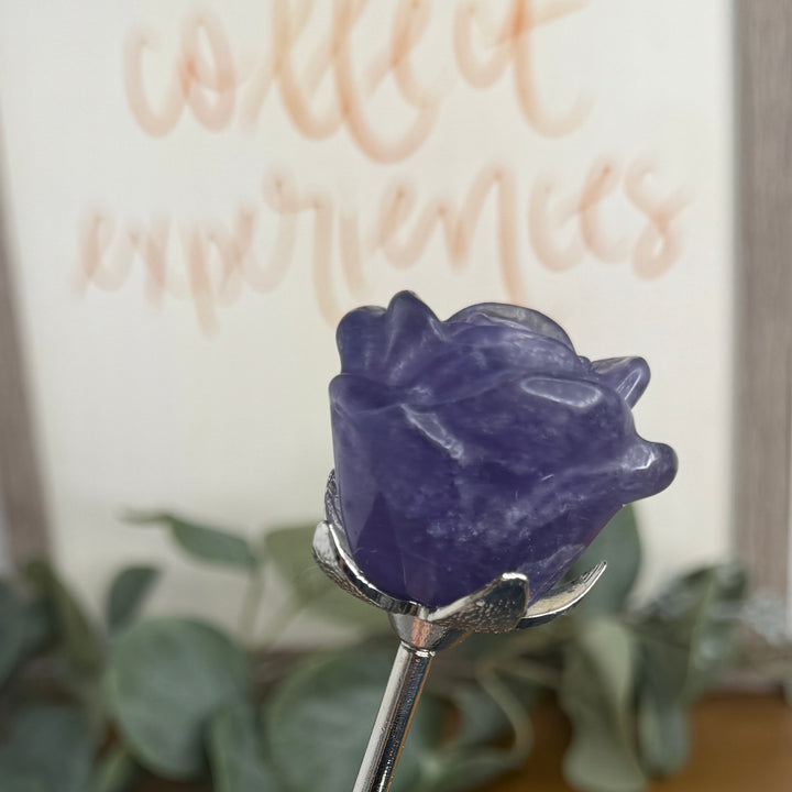 A true masterpiece of nature and craftsmanship, this Purple Fluorite Rose with Stem blends the ethereal beauty of a blooming rose with the metaphysical depth of fluorite. Each petal is intricately carved to capture the grace of a rose in full bloom, while the stone itself radiates calming, clarifying energy that brings the mind and heart into harmony.